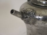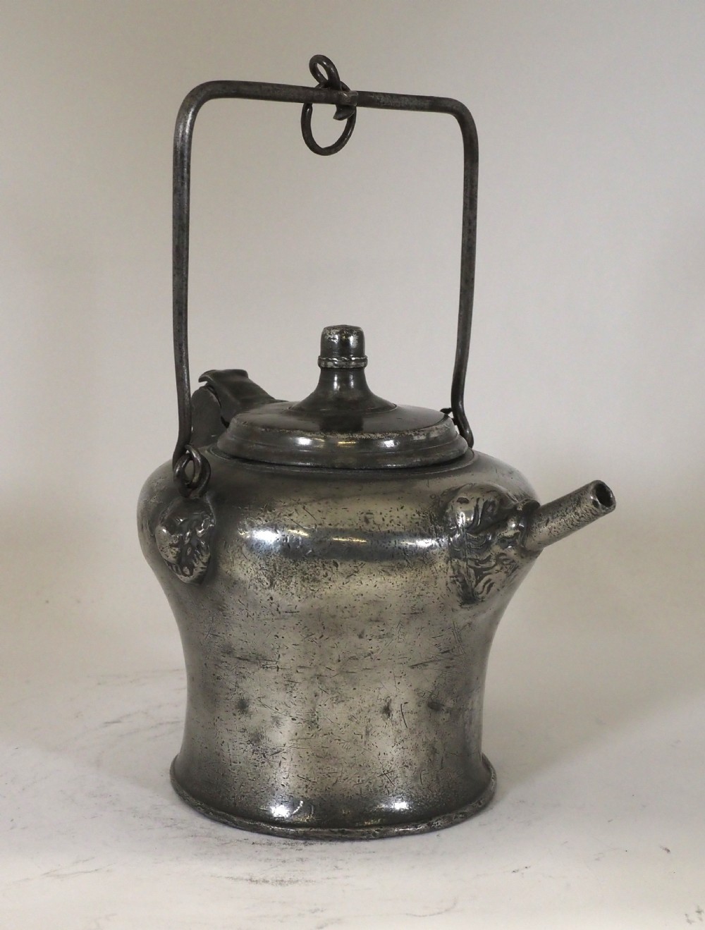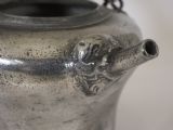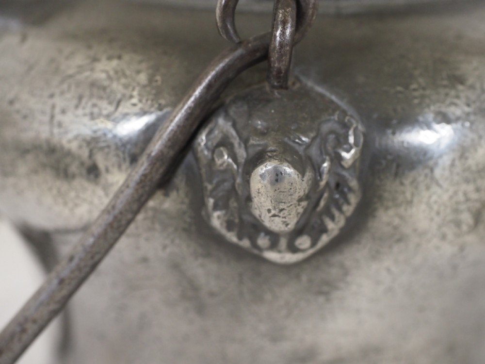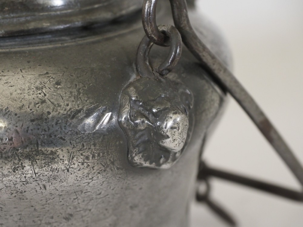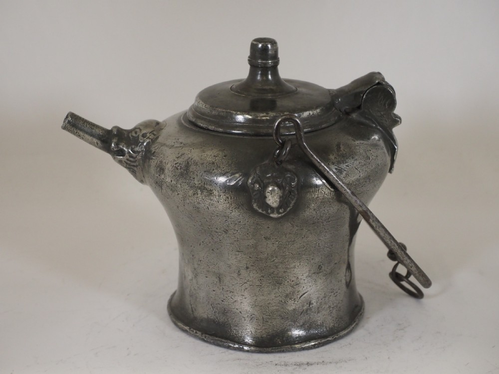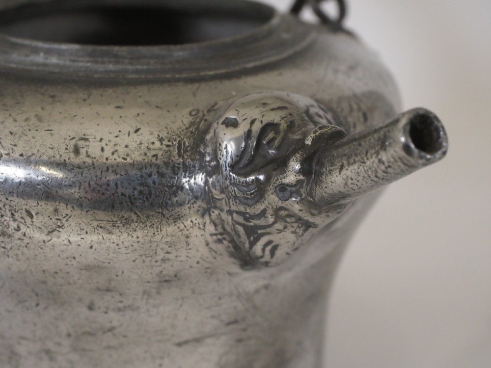 Description: A scarce example of a Swiss pewter 'biberon'; these were usually hung from a bracket on the wall in a Swiss farmhouse kitchen, they contained the clean fresh drinking water for the family, the water would be drawn through the spout on the front. This fine example has bears head castings to the spout and where the swing handle joins the body. Circa 1730. Literature: See H H Cotterell; National Types of Old Pewter, page 64 for a discussion and images of biberon's. Condition: Excellent condition with a polished silver grey finish and some small traces of light oxide. Repairs: There are no repairs that I could detect. Size: Height: 6.50 in (16.50cm). Base diameter: 5.00in (12.50cm). Capacity: Approximately 1 litre. There are no makers marks. Shipping costs: UK: £15.00 Europe: £35.00 USA/Canada: £50.00 Other countries: Please ask. Stock number: P-285. Please be aware that exports outside of the UK may incur local Tax and Duty, please check with your local Customs Office. Please view our extensive collection of antique carpets & rugs at www.knightsantiques.co.uk. If you would like to receive further details of new stock as it arrives then please send your email address to: simon@knightsantiques.co.uk and ask to be added to the new arrivals list. Internal Ref: P-285