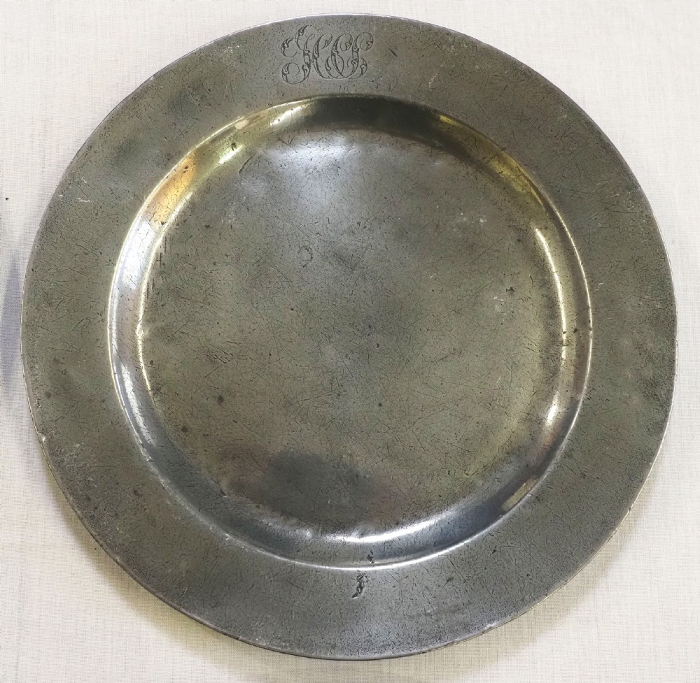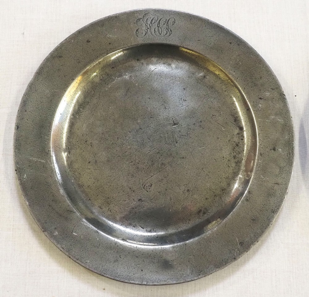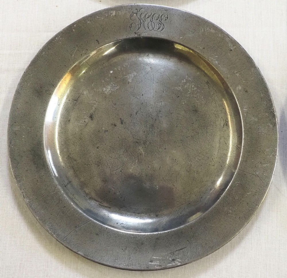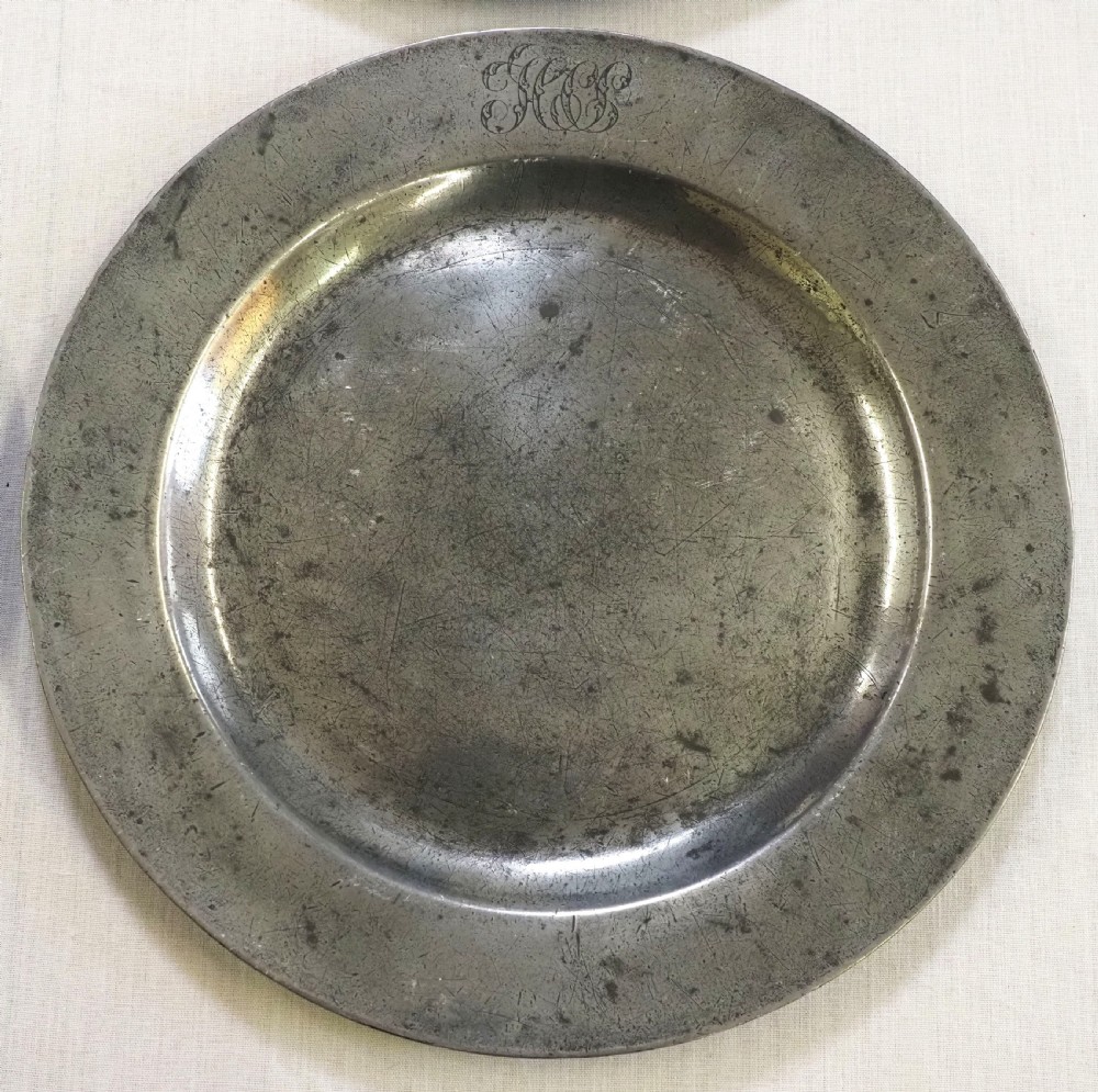 Description: A good set of four antique English pewter plain rim plates of 9.750 inch diameter. The front rim of each plate has a very well engraved set of ownership initials 'HCS'. The reverse of each plate has a touchmark for T & H Compton (Townsend & Henry Compton) of London, who worked 1814 - 1835. There is also a 'superfine hardmetal' mark and a crowned X. Condition: The plates are in excellent condition with a very lightly polished finish to the front, with some small traces of oxide. The reverse is unpolished with some light oxide. Repairs: There are no repairs. Size: 9.750 inch diameter (25.00cm). Pewterer's reference number: Pewter Society: PS1867. Cotterell: Old Pewter: Its Makers and Marks: OP1063. Shipping costs: UK: £15.00 Europe: £40.00 USA/Canada: £60.00 Other countries: Please ask. Stock number: P-313. Please be aware that exports outside of the UK may incur local Tax and Duty, please check with your local Customs Office. Please view our extensive collection of antique carpets & rugs at www.knightsantiques.co.uk. If you would like to receive further details of new stock as it arrives then please send your email address to: simon@knightsantiques.co.uk and ask to be added to the new arrivals list. Internal Ref: P-313