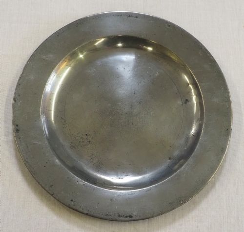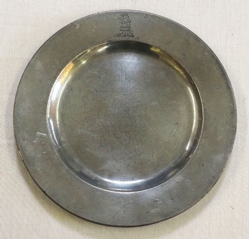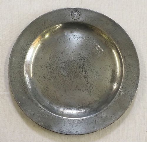 Antique English pewter broad rim charger of impressive large size. The rim is engrave with a mantled coat of arms, and also bears a set of hallmarks for an unrecorded maker. The reverse rim bears a shield shaped possible makers mark along with a triad 'G' over 'G E'.